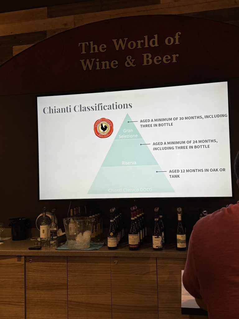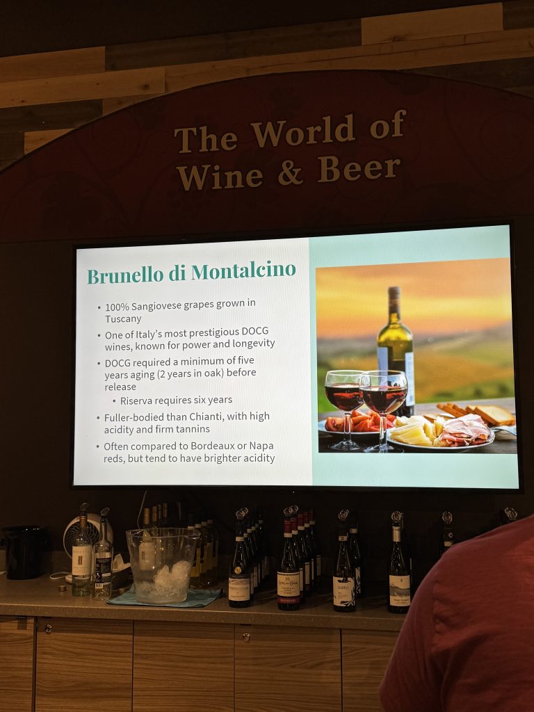 Another interesting topic that came up during the tasting was Italy’s wine classification system, which helps indicate quality and regional authenticity. At the top is DOCG (Denominazione di Origine Controllata e Garantita), the highest classification. Wines with this designation must meet strict regulations around grape varieties, production methods, and aging requirements. Brunello di Montalcino is a great example of a DOCG wine.